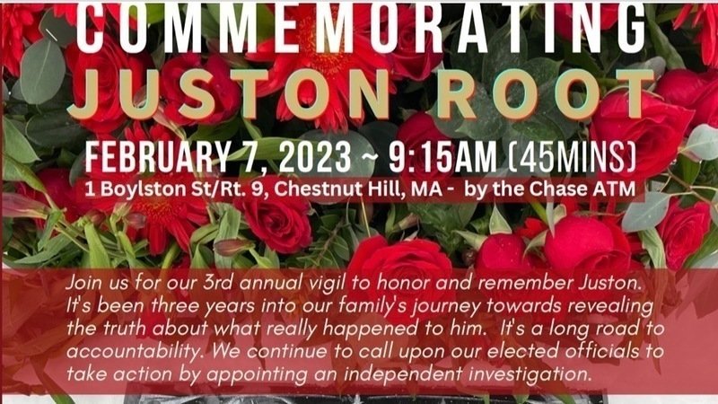 The Root family will be holding our 3rd Annual Vigil for Juston Root. Tuesday February 7, 2023 - Just outside Boston, MA in Chestnut Hill (Brookline, MA).
