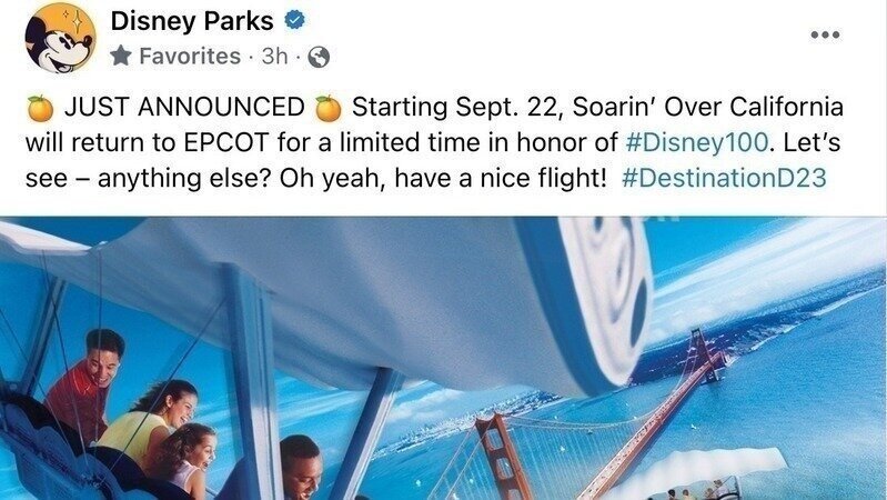 Disney announced today at #DestinationD23 that Soarin Over California will return to EPCOT in honor of the #Disney100 Celebration they're currently having! But in my mind, I think we still need to tell Disney to make it a permanent attraction at #DisneyCaliforniaAdventurePark at the #DisneylandResort.