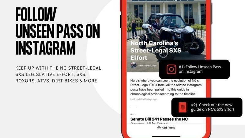 Follow Unseen Pass on Instagram to keep up with the NC Street-Legal SXS Legislative Effort (Senate Bill 241) and more.