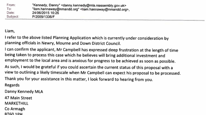 In 2015, former Northern Ireland Transport Minister and current Ulster Unionist Party European election candidate Danny Kennedy lobbied Newry, Mourne and Down District Council chief executive Liam Hannaway on behalf of JC Campbell owner Colin Campbell. The planning application he lobbied in support of is a major residential development next to the A2 protected route between Rostrevor and Kilkeel. Is it a coincidence that Mr Kennedy's reign as Transport Minister coincided with his department's inexplicable decision to bypass a transport assessment for this development? As Mr Kennedy is now standing for public office again we believe these revelations warrant a comment from the European election candidate.