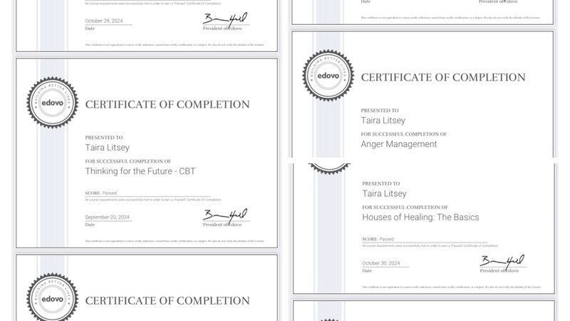 Some of the classes Taira has taken to better herself. She has also taken a Microsoft Office class and the NCRC class(National Career Readiness Certificate). She has also gotten her GED while in prison and signed up for many other classes but can not get entrance to them because she is said to be too far from parole date. Personally, I find this a tragedy because Taira would take any class that would make her more ready to join society. The prison will now be offering a culinary class as well as a cosmetology class that she has signed up in hopes of entering. Also, on a random note but also showing the excessiveness of her sentence, I was watching a show tonight regarding the likes of Carlos Lehder(crazy Carlos from the movie Blow with Johnny Depp) and Cristopher Coke, who are both international kingpins who were part of murderous drug organizations and Carlos is out of prison in less than 30 years later now living free in Germany and Coke will be released in 2030 about 19-20 years after originally being imprisoned. Seeing these sentences leaves me in awe knowing they served likely less time than Taira unless one of her appeals is successful. Also, Taira wanted me to update everyone and let you all know she is doing alright all things considered. She’s keeping her head up and maintains a healthy relationship with her children. We are now happily married and have a great relationship. We can’t wait for the day she gets to walk out!