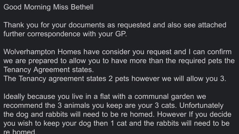 So after 2 weeks of no reply and no communication I received this yesterday stating that they allowing me 3 pets instead of 2 and they want me to rehome my dog and rabbits when the rabbits are not in the flat they in the garden. And the dog is smaller than the cats and by having the dog it helps me get out the flat more as I few safe so they still not allowing me to have 3 cats and dog they are coming out in 8 weeks to check the flat so will update when we now more.