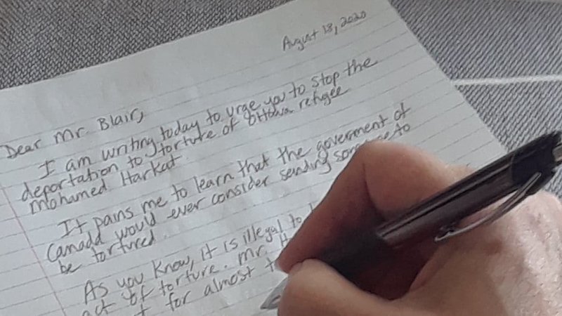 2. Write a letter (sample below, feel free to personalize it). If handwriting is a problem, you can type a letter and print it out with your signature (if typing, maybe handwrite an additional sentence as well as a PS, like “Canada should never deport anyone to torture. This must end!"