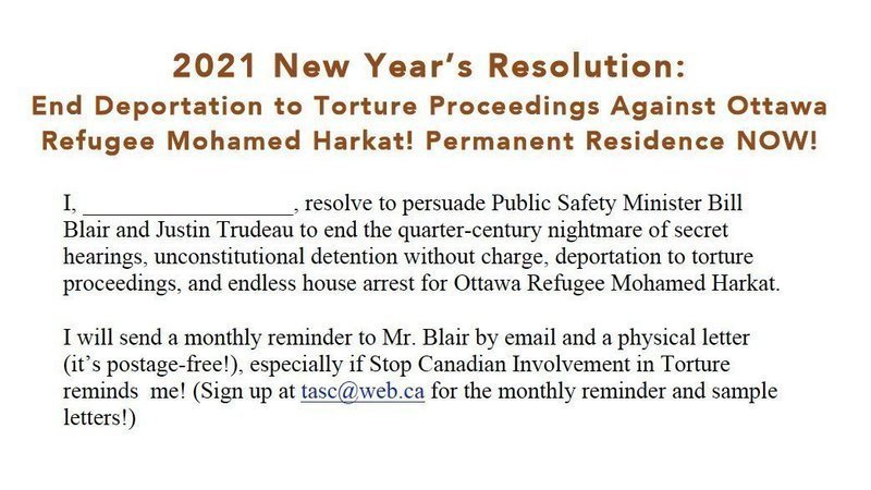 Each month in 2021, please send a brief letter (postage-free!) and email to Public Safety Minister Bill Blair to stop the persecution of Ottawa refugee Mohamed Harkat, still fighting to end his deportation to torture and win his long-deserved permanent residence (samples below.) If you would like a monthly reminder, let us know at tasc@web.ca!