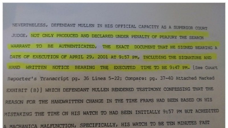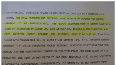 Through rendered testimony of office Judge Mullen forged a signed and dated warrant which has later undergone several attempts to change the actual time of incident. Handwriting expert analysis found the signature on the warrant did not match Judge Mullen signature which Mullen swore otherwise.