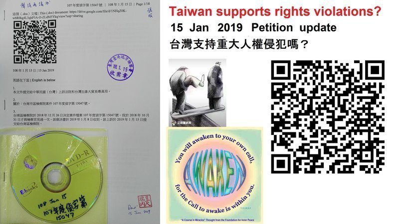 這成為國家安全問題(不是開玩笑)。事件的總結是對完全理解所必要的。台灣政府可以選擇允許大公司繼續規避台灣的國家法律,或者幫助我倡導國際司法。台灣的國際聲譽直接面臨風險。該文件的副本可在以下網址獲得在2019年1月15日“台灣支持重大人權侵犯嗎?”請願書更新:https://www.change.org/p/her-excellence-ms-tsai-please-help-us-correct-injustices-occurring-in-canada/u/23883075