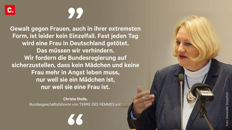 "Aufgrund noch immer fehlender Datenerhebung und Differenzierung, fordern wir, dass Daten zu geschlechtsspezifischer Gewalt regelmäßig und umfangreich erhoben werden müssen, auch unter Berücksichtigung der Folgen von Gewalt auf das weitere (Erwerbs-)Leben. Gewalt gegen Frauen, auch in ihrer extremsten Form, ist leider kein Einzelfall. Fast jeden Tag wird eine Frau in Deutschland getötet. Das müssen wir verhindern. Wir fordern die Bundesregierung auf sicherzustellen, dass kein Mädchen und keine Frau mehr in Angst leben muss, nur weil sie ein Mädchen ist, nur weil sie eine Frau ist." sagt Christa Stolle (Bundesgeschäftsführerin von TERRE DES FEMMES e.V.)