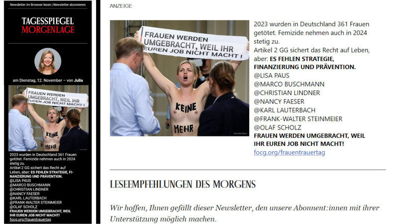 Mit unserer halbseitigen Anzeige zu deutschen Femiziden erzielen wir eine Reichweite von 394.000 Leserinnen und Lesern.