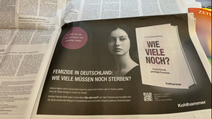 + Der Verlag Kohlhammer hat das Buch „WIE VIELE NOCH? Deutschlands gebilligte Femizide“, das die strukturellen Defizite der Regierung schonungslos offenlegt, mittlerweile mit jeweils halbseitigen Anzeigen in der WELT, der FAZ, der NZZ (nationale Ausgabe), der TAZ, der Rhein Main Media (RMM) Großraumausgabe, der ZEIT und der Süddeutsche Zeitung beworben.