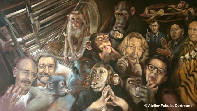 Das beigefügte Bild "Was in der Arche übrig bleibt..." der Künstlerin Olivia Rost bildet auf der linken Seite die Affenhirnforscher Prof. Hans-Peter Thier und Prof. Stefan Treue ab, sowie auch auf der rechten Seite die Frau Wissenschaftsministerin in Baden-Württemberg, Theresia Bauer, die als "unstreitig" erklärt, dass man auf Experimente an Affen nicht verzichten kann.