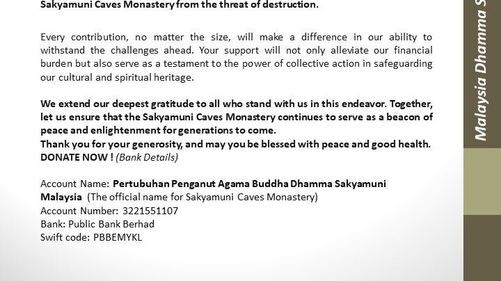 However, legal proceedings entail significant financial resources, and we cannot undertake this fight alone. We turn to our community of supporters, numbering over 32,000 strong, to rally behind us in this critical moment. Your generous donations will play a vital role in covering the legal fees necessary to pursue justice and protect the Sakyamuni Caves Monastery and Gunung Kanthan from the threat of destruction.