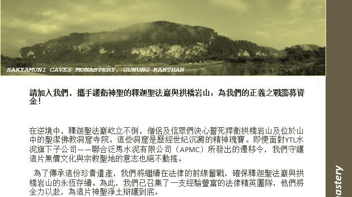 Petition updateSave Sakyamuni Caves Monastery, Save Gunung Kanthan 拯救《释迦圣法岩》也就是在拯救 拱桥岩山請加入我們,攜手護衛神聖的釋迦聖法巖與拱橋岩山:為我們的正義之戰籌募資金!