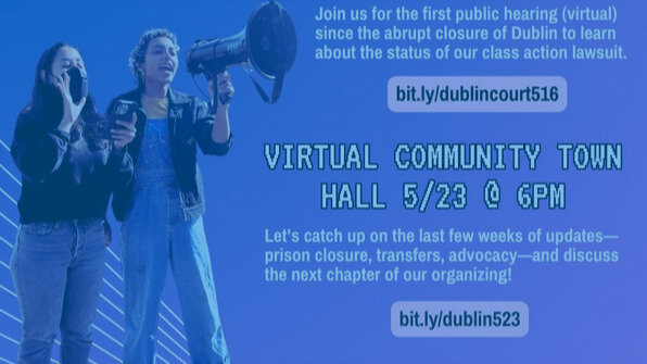 Please join the Dublin Prison Solidarity Coalition for an important public hearing this Wednesday morning to hear about next steps of our class action lawsuit against the Bureau of Prisons. This is the first public hearing since FCI Dublin was abruptly closed! Then we will host a virtual town hall Thursday evening so our broader community can come together to learn more about our coalition's advocacy and how to get involved.