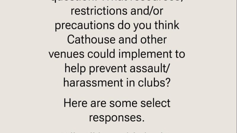 "Properly training their bouncers and having bouncers or in-house staff who don't laugh in the face of people who are reporting assault. I've experienced multiple issues with their bouncers as they work between cathouse and garage and any time assault is reported they blame the victim and throw them out the venue" -has experienced/known/witnessed assault, 22-25, female.