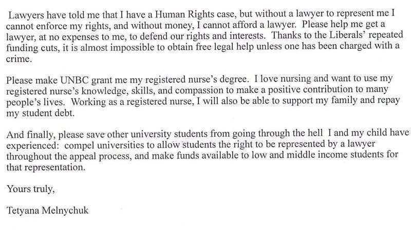 Mise à jour sur la pétitionGrant Tetyana Melnychuk her Bachelor of Science in Nursing degree which UNBC withheld through discrimination and abuseHuman Rights: Where are they ?