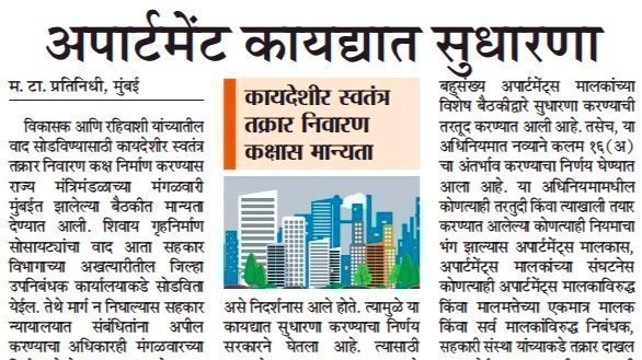 The thousands of apartment owners of residential buildings registered as Apartments under the Maharashtra Apartment Ownership Act 1970 had to approach the civil court for their grievances against the builder, members for unpaid maintenance, other issues, etc.
