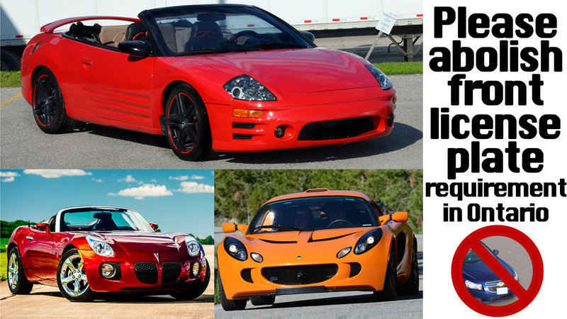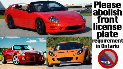 We, the Undersigned, petition the Province of Ontario to revoke the current law requiring the display of a front license plate on passenger vehicles.