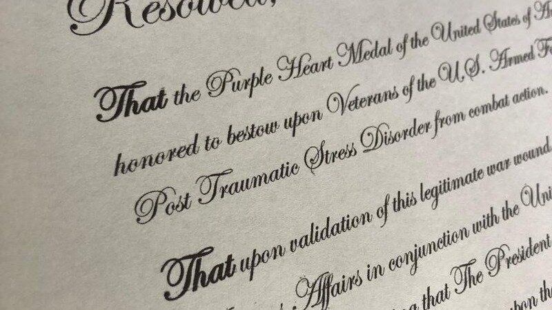 That the Purple Heart Medal of the United States of America be honored to bestow upon Veterans of the U.S. Armed Forces who live with Post Traumatic Stress Disorder from combat action.