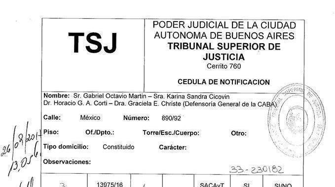 A través de una cédula de notificación el Tribunal Superior de Justicia de la Ciudad Autónoma de Buenos Aires cita a las partes a una audiencia que se realizara el próximo 5 de Octubre a las 10:30hs. en Cerrito 760.