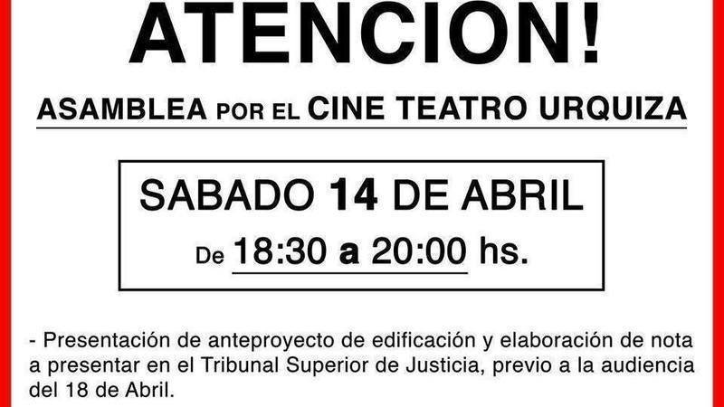 Sábado 14 de Abril, de 18:30 a 20:00 hs. Asamblea por el Cine Teatro Urquiza.