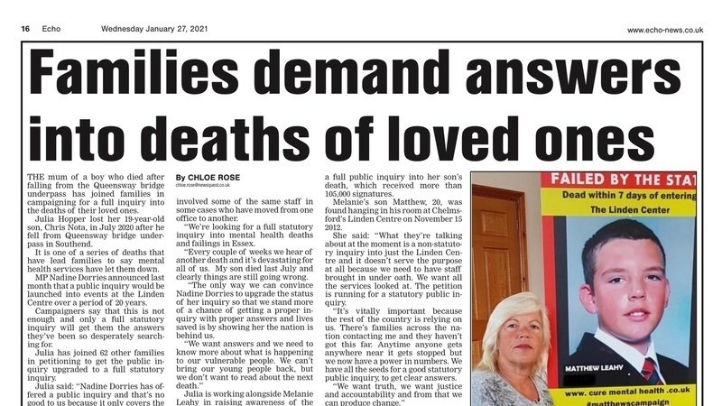 Our loved ones lost their lives due to a catalogue of failings in Mental health hospitals and in the community in Essex, but the same failings and multiple deaths are happening all over the country.