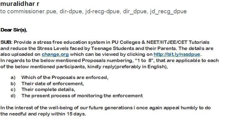 Обновление к петицииProvide Stress Free Education System for Teenage Students of 10+2/PU/IITJEE/NEET/CETEmail to DPUE