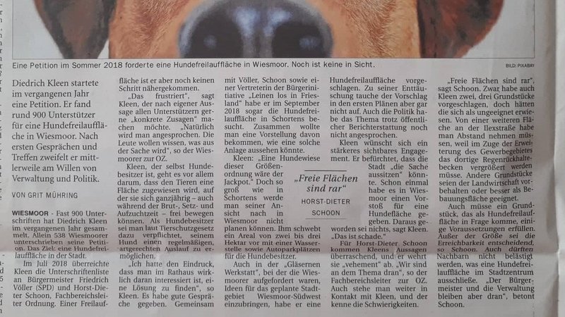 Nach langer Zeit möchte ich Euch ein Update zur Petition einer Freilauffläche in Wiesmoor geben. Dazu habe ich den Beitrag in der örtlichen Tageszeitung (Ostfriesen Zeitung, 13.09.19) beigefügt. Tatsache ist, dass es nicht weiter geht, da seitens der Stadt bisher noch keine Fläche angeboten werden konnte. Trotz Zusagen, aktiv zu suchen, ist das Ergebnis milde gesagt "Ernüchternd". Aber ich gebe nicht auf und werde weiter der Stadt auf die Finger klopfen und unbequem bleiben.