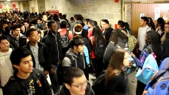 Note: The photo above is a typical passing period in the high school hallways. Overcrowded--tough to make it to class on time!