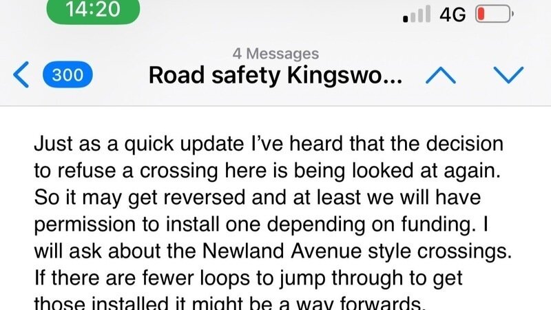 Thank you once more for creating and sharing the petition. If we can share it too that will be great. Local resident pressure is going to help push this forwards. I will update once I know more about whether the decision to not allow us a crossing can be reversed and also if we have been successful in our bid for Government funding for pedestrian infrastructure projects in Kingswood.
