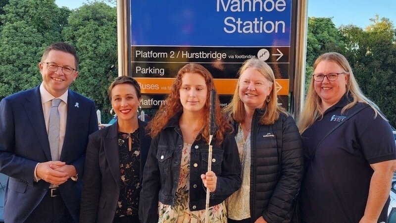 This morning at 8am we caught up at Ivanhoe Station with Ivanhoe's local member of Parliament, Hon. Anthony Carbines and the Minister for Transport Infrastructure and Minister for Public and Active Transport, Hon. Gabrielle Williams along with Marnie Roth from Confident Steps, Lilly's Orientation and Mobility instructor.