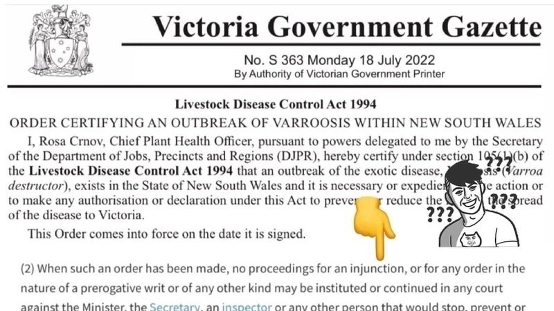 The Victorian Government are using the bio security laws to hamper our attempts to stop varroa entering Victoria by trying to ban us getting an injunction to stop the movement of hives into Victoria.