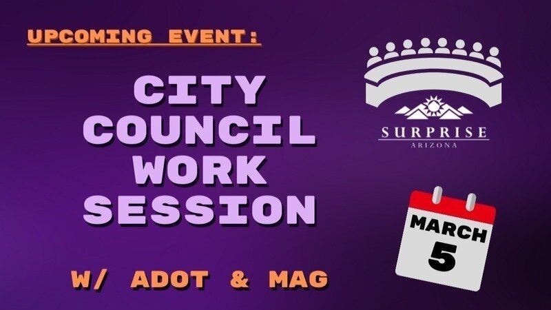 The Maricopa Association of Governments (MAG) & the Arizona Department of Transportation (ADOT) will be in attendance at this week's Surprise City Council work session. The will be presenting the same materials that they went over at Councilman Haney's meeting back right before the Christmas holiday.