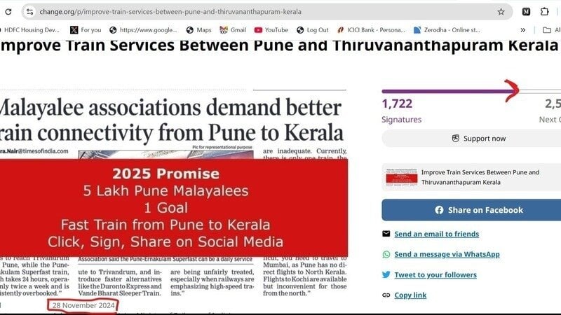 Neuigkeit zur PetitionImprove Train Services Between Pune and Thiruvananthapuram Kerala1722 Signatures Collected