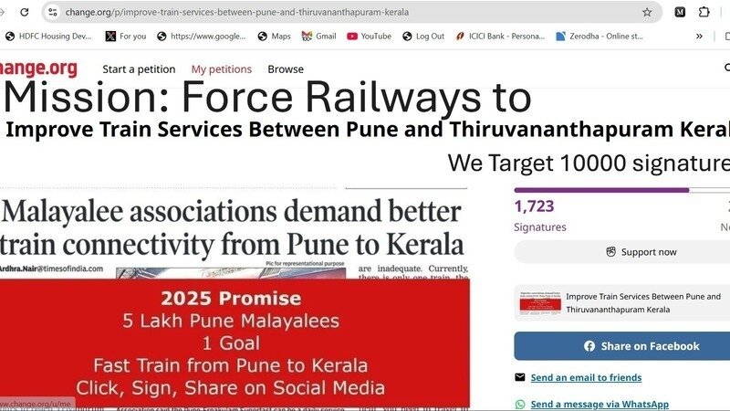 Our Mission: Improve Train Services between Pune to Kerala. Our Target: 10,000 signatures. From 28 November 2024, for a few Pune Malayalees sharing this message on social media was a like a fulltime/part time job. Creating ads, messages, videos etc. In the end, we got tired and stopped our efforts. Without Pune Malayalees support how long can you battle alone. Now the signatures on change.org have stopped at 1723. Getting better trains is not going to benefit a few Malayalees. It will benefit all Pune Malayalees. All Pune Malayalees have to work as Team to make this message viral on social media. It is time for each Pune Malyalee to introspect and think what have you done to make this campaign popular, viral and get the signatures? You just read, this messaged and kept quiet. Sad.