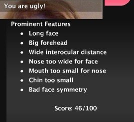 Prettyscale is a website that tells you what percent out of 100 you are pretty. After scanning your facial dimensions, it tells you the good features you have, and then goes on to list all of the things that are "wrong" with your face. This website is damaging to anybody and promotes low self esteem by giving you a "pretty rating." Please sign this petition and have the website taken down, the reason why anybody decided this would be a good idea in the first place is beyond me.