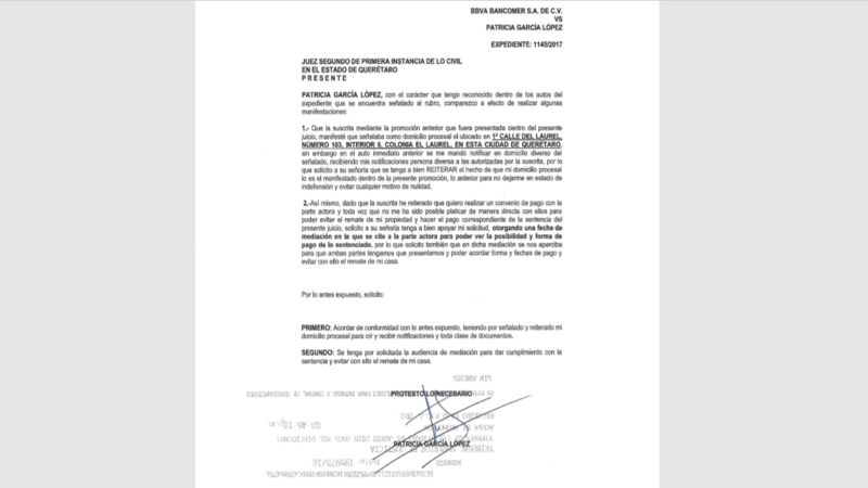 Al mismo tiempo en el mes de mayo presentamos nuestra solicitud del plan de pagos al Juez segundo de primera instancia de lo civil, con el deseo de llegar al pago total de la casa. El juez le hizo de su conocimiento a Lic. José Manuel Vázquez Acuña, Representante del despacho de abogados que BBVA Bancomer contrató.