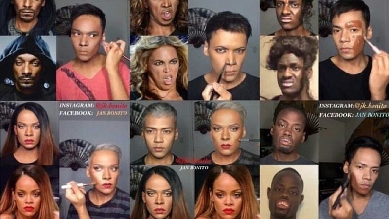 Jan Bonito (@jk.bonito on instagram) although very talented in his work of art , performs black face on numerous occasions. He paints his face as many black celebrities. For those unaware of what black face is , it , in the past , was used by non black actors to imitate and mimic the black race , with discrimination , racism , prejudice , etc . They achieved this by painting their face black and making plays and comedy sessions. Now , black face in general is when someone paints their face a darker shade than its supposed to be (when it's obviously far from their skin tone) or when they paint their face a darker shade to imitate black people , or another race. He blocks everyone who calls him out , and ignores all of our input and doesn't say a word