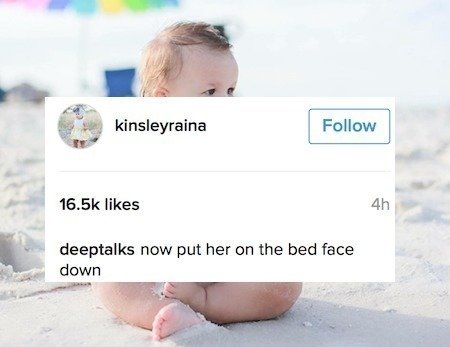 Kinsley Raina is a baby and her image is being exploited in exchange for "Internet Stardom" and free baby items. The images posted to Kinsley's Instagram account (@kinsleyraina) are disturbing to say the least. While some could easily be brushed aside as cute baby photos, the overall account exemplifies a larger message to Kinsley's audience: Her body and image are yours for the taking -- do whatever (and we mean WHATEVER) you want with them.