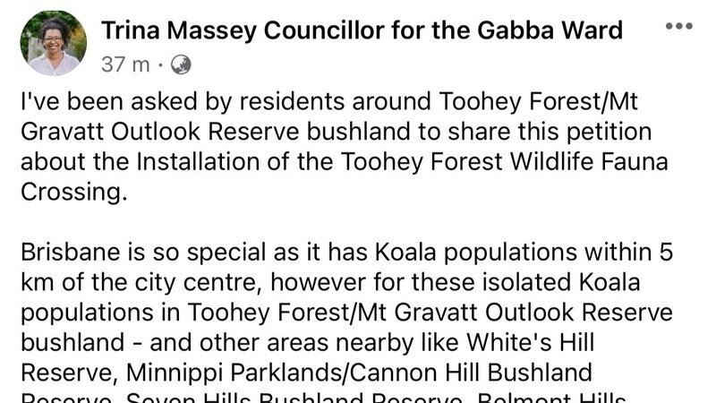 Petition updateInstallation of the Toohey Forest Wildlife Fauna CrossingCouncillor Trina Massey and Greenpeace Australia support our petition