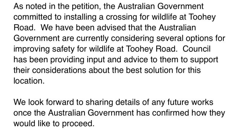 As noted in the petition, the Australian Government committed to installing a crossing for wildlife at Toohey Road. We have been advised that the Australian Government are currently considering several options for improving safety for wildlife at Toohey Road. Council has been providing input and advice to them to support their considerations about the best solution for this location.