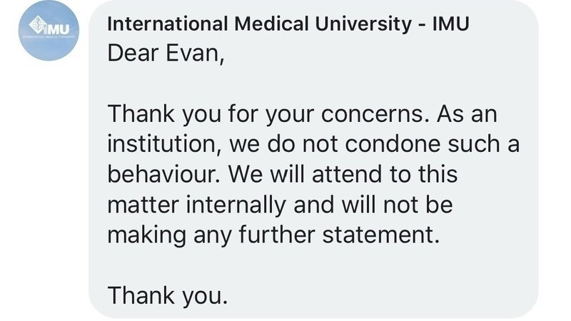 In our attempt to bring this concerned matter to International Medical University (IMU), they have responded via Facebook with the following statement: