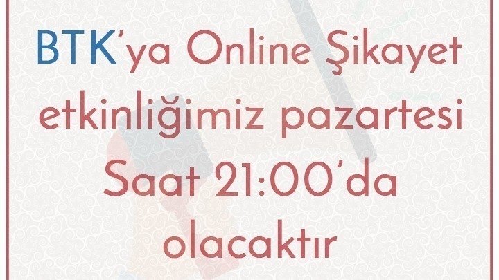 BTK, rapolarında kullanıcı şikayetlerini dikkate aldığını yazıyor. Biz de sesimizi daha iyi duyurabilmek için pazartesi günü toplu şikayet etkinliği yapacağız. Detaylı bilgiye şu linkten ulaşabilirsiniz:
