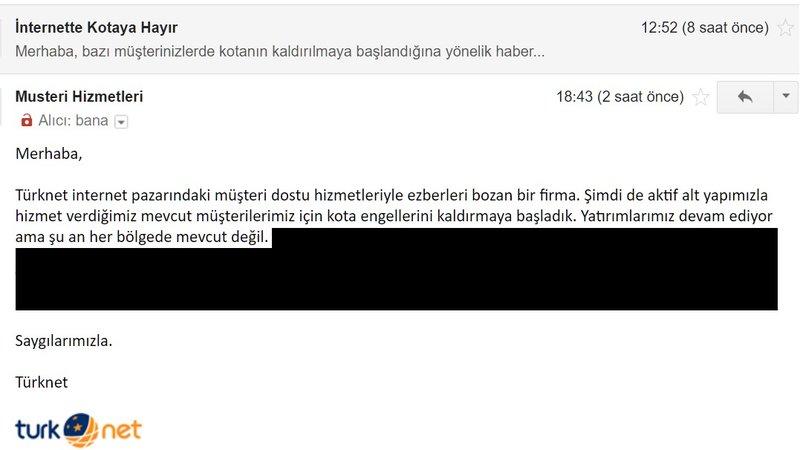 Geçtiğimiz günlerde TürkNet abonesi destekçilerimizden kotalarının kaldırıldığına dair mesajlar almaya başladık ve bunun üzerine TürkNet Müşteri Hizmetleri'nden bu durum hakkında bilgi istedik. Verdikleri cevapta kendi altyapıları ile hizmet verdikleri bölgelerde kotanın kaldırılmaya başlandığını belirttiler.