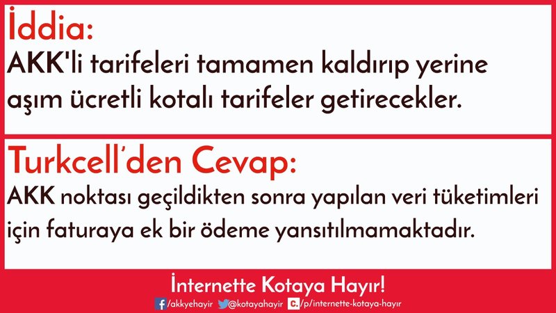 Turkcell Superonline tarafından, BTK’nın yeni mevzuatına göre AKK'li tarifelerde kota aşımı sonrası GB başına ücret alınmayacağı belirtilmiş, fakat mevzuata göre bu zaten söz konusu olamaz, dolayısıyla böyle bir iddia da söz konusu değildi. Ortadaki esas iddia, yani yeni gelecek tarifelerde AKK yerine aşım ücretli kota bulunacağı iddiası halen cevapsızdır. Turkcell’den, yeni gelecek tarifelerin taahhütleri dolacak ve yeni abone olacak kullanıcıları aşım ücretli KOTA gibi AKK’den bile daha ilkel bir uygulamaya mahkum etmeyecek ve sonuçta bir mağduriyete yol açmayacak şekilde düzenleneceğine ilişkin bir garanti beklemekteyiz.