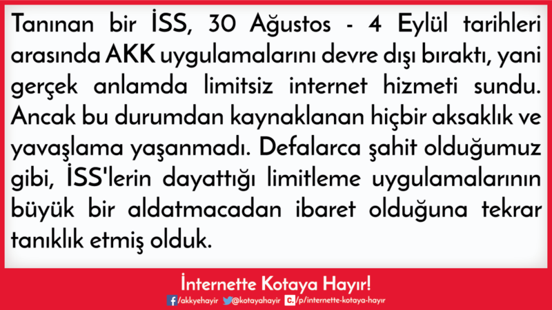 Bu İSS, 1 Mayıs düzenlemesinin ardından alelacele hamlelerle "dolduğunda interneti kesen kota, aşım ücretli kota" gibi limitlemelere sahip tarifeler çıkarıp AKK uygulamasını dahi kullanıcılara fazla görmüştü.