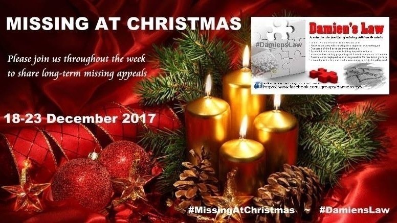 In conjunction with our manifesto, promising to be a voice for missing children & young adults, from 18-23 December we are running Missing At Christmas appeals for 60 families with long-term missing loved ones. We would be delighted if you could join our Facebook group to help share these appeals, to raise much needed awareness. Too many families with have an empty chair at the festive table, so let’s try to change that together.