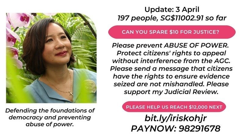 "I am making an appeal to financially support Iris Koh to start a judicial review of how her case was handled in order to stop any abuse of power.