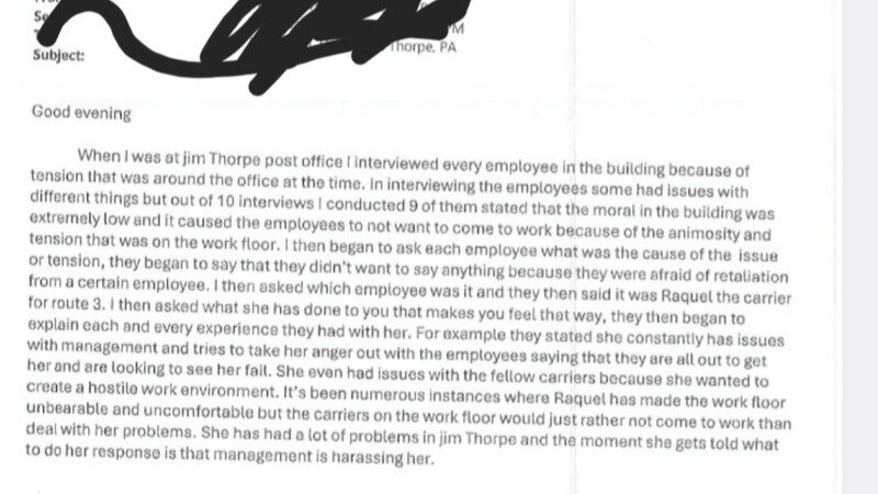 This is a Postmaster from another office who covered our office for a few weeks last year. He was there to train my DUA because he said her numbers weren't adding up and she was doing a horrible job running this office. He told everyone how great we all got along with each other when he was here those 2 weeks. Then when he found out my DUA was trying to fire me he did a complete 180 and wrote this false and slanderous statement about me without any evidence at all. I've shown this letter to 9 out of 10 people in my office and nobody is backing up anything he wrote. Talk about being a total evil DOUCHEBAG trying to ruin the career of someone who earned it and didn't lick ass like you did on your way to management. Go **** yourself Mike!