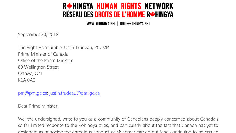 We, the undersigned, write to you as a community of Canadians deeply concerned about Canada’s so far limited response to the Rohingya crisis, and particularly about the fact that Canada has yet to designate as genocide the egregious conduct of Myanmar carried out (and continuing to be carried out) against that country’s defenseless Rohingya ethnic minority.