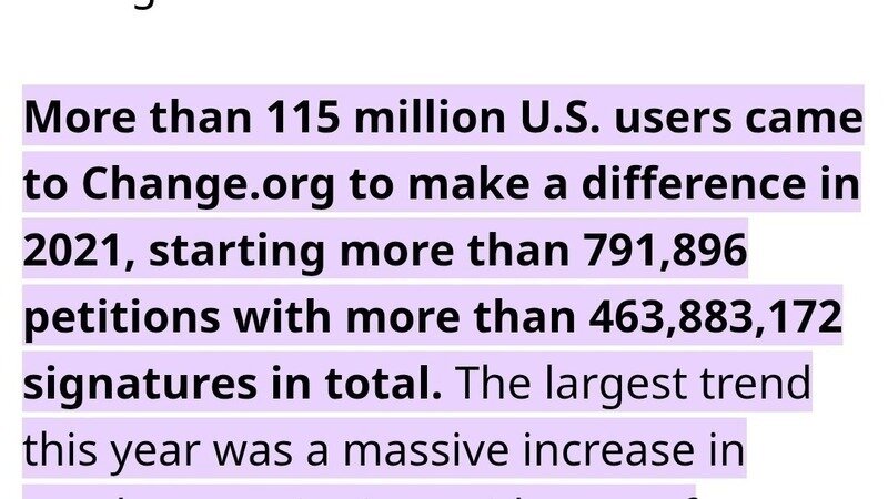 Change.org had released some statistics that show, that in the US alone, in one year, 791,896 petitions were started which got 483 million signatures.. statistics for one year! A snapshot of these statistics from the website of Change.org included above.